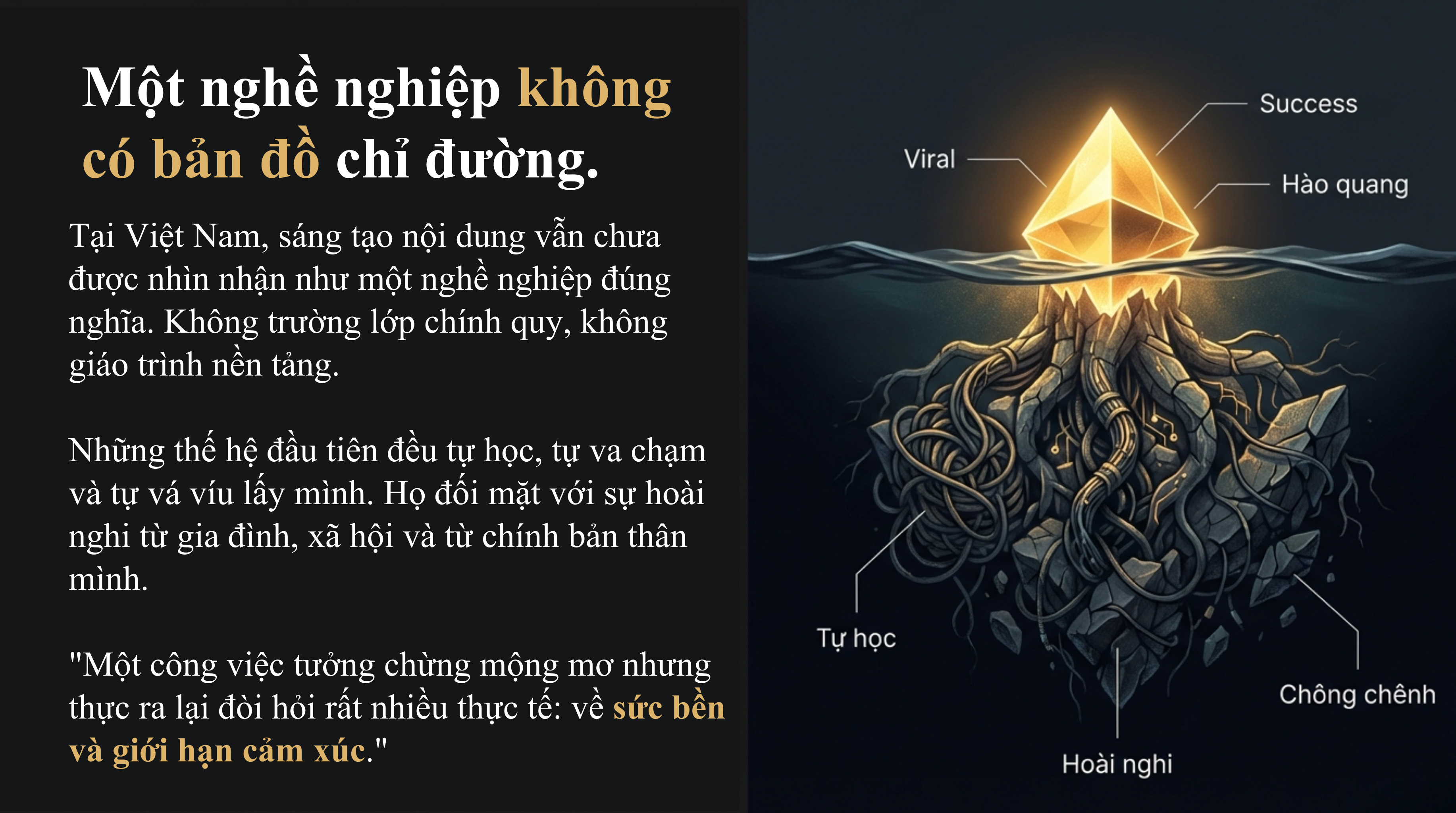 Tại Việt Nam, sáng tạo - đặc biệt là sáng tạo nội dung vẫn chưa được nhìn nhận như một nghề nghiệp đúng nghĩa. Chưa có trường lớp chính quy, không giáo trình nền tảng, không lộ trình nghề nghiệp rõ ràng. Những thế hệ đầu tiên bước vào ngành này, hầu hết đều tự học, tự va chạm, và tự vá víu lấy mình sau mỗi lần chông chênh. Họ không chỉ đối mặt với sự hoài nghi từ xã hội và gia đình, mà đôi khi còn từ chính bản thân mình.