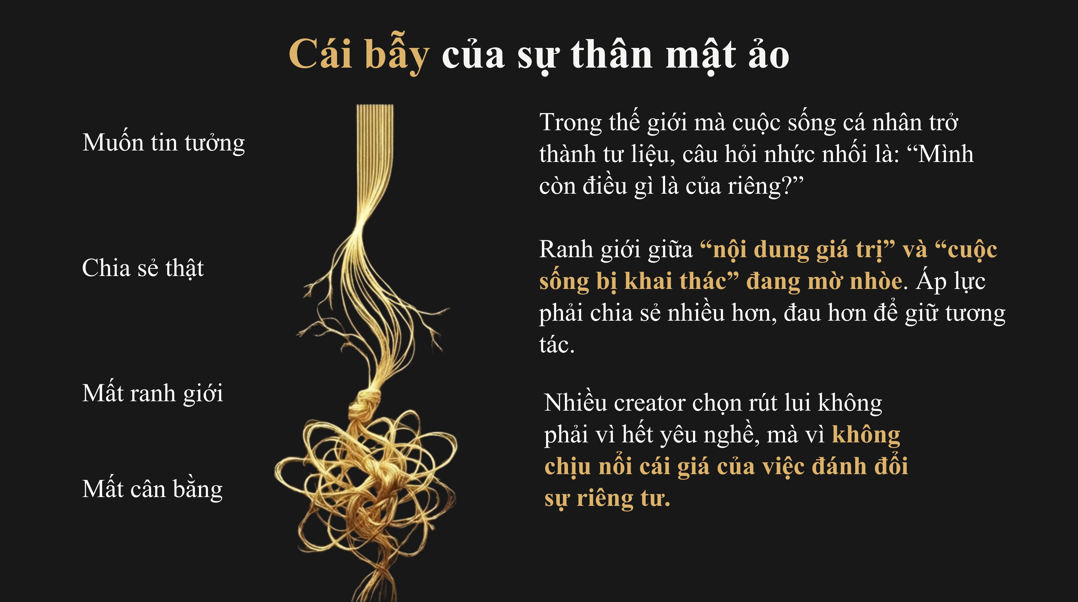 Muốn được tin tưởng → phải chia sẻ thật → chia sẻ nhiều → mất dần ranh giới → mất cân bằng nội tâm.